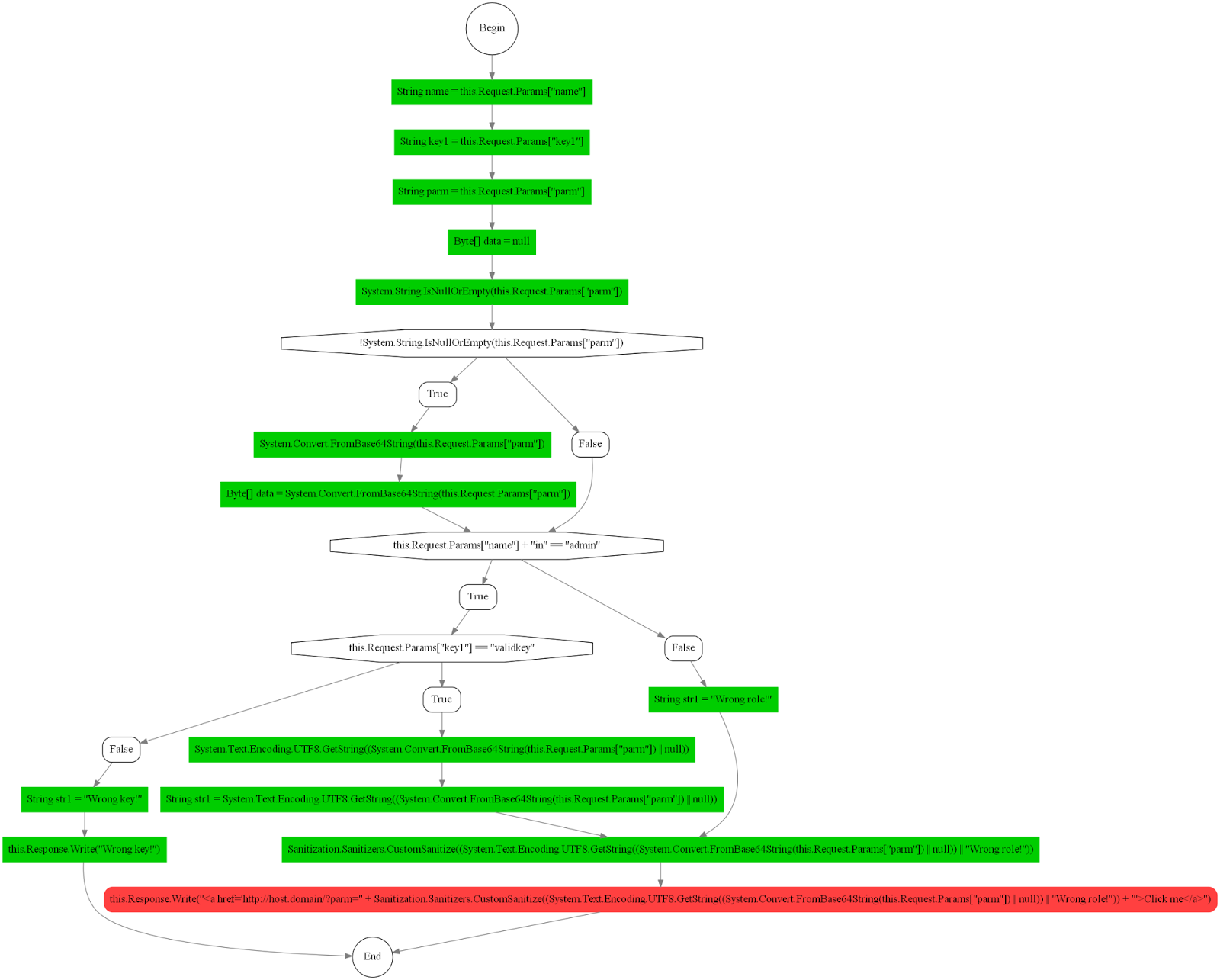 string name = Request.Params["name"]; string key1 = Request.Params["key1"]; string parm = Request.Params["parm"]; byte[] data; if (string.IsNullOrEmpty(parm)) { data = new byte[0]; } else { data = Convert.FromBase64String(parm); } string str1; if (name + "in" == "admin") { if (key1 == "validkey") { str1 = Encoding.UTF8.GetString(data); } else { str1 = "Wrong key!"; Response.Write(str1); return; } } else { str1 = "Wrong role!"; } Response.Write("<a href='http://host.domain' onclick='" + CustomSanitize(str1) + "'>Click me</a>");