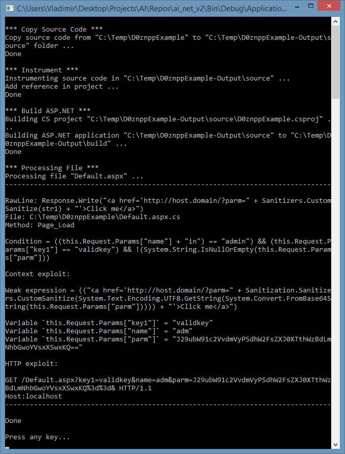 В первую очередь, кейс заключается в поиске недостатков в коде и подтверждении их уязвимости к тем или иным классам атак. Задача по автоматической генерации эксплоитов в рамках данного кейса сводится к выводу минимального вектора атаки, подтверждающего существование уязвимости. При этом, под вектором подразумевается не конкретный HTTP-запрос, а некоторая совокупность факторов, приводящая систему в состояние уязвимости и позволяющая провести на нее успешную атаку. Скажу даже больше: в общем случае, выразить вектор атаки в виде только HTTP запроса не представляется возможным. Во-первых, потому что данный вектор может требовать выполнения нескольких запросов. Во-вторых (и это главное), потому что вектор может включать в себя условия на какие-либо свойства окружения, которые невозможно описать в контексте запроса HTTP. Тем не менее, в рамках рассматриваемого кейса мы должны: а) вывести все подобные условия; б) каким-то образом оформить их в результатах анализа. Именно это и привело к столь замысловатому определению вектора. Приведу простой пример (здесь и далее рассматривается код на C# под ASP.NET Web Forms):
