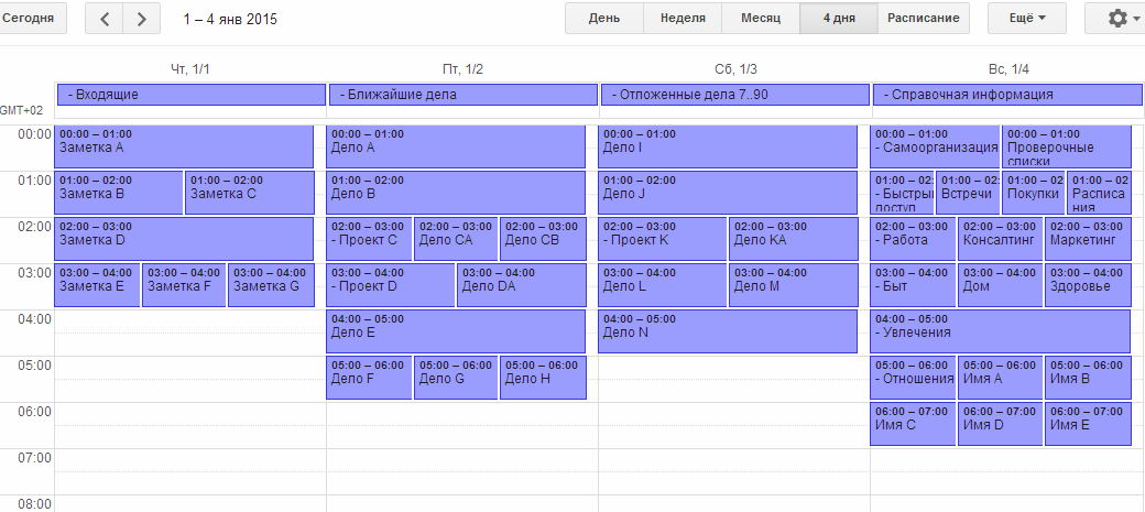 Примерный вид Google Calendar после реализации обеих этапов методики самоорганизации, предложенной в книге:
