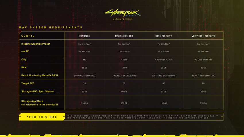 В пресс-релизе CD Projekt отмечала, что Cyberpunk 2077 будет работать даже на базовых процессорах M1 с 16 ГБ объединённой памяти. Это так, но в таком случае получится запустить игру в нативном разрешении 1440 × 900 или 1600 × 900 с апскейлом MetalFX. Частота кадров в секунду на таком Mac будет около 30.