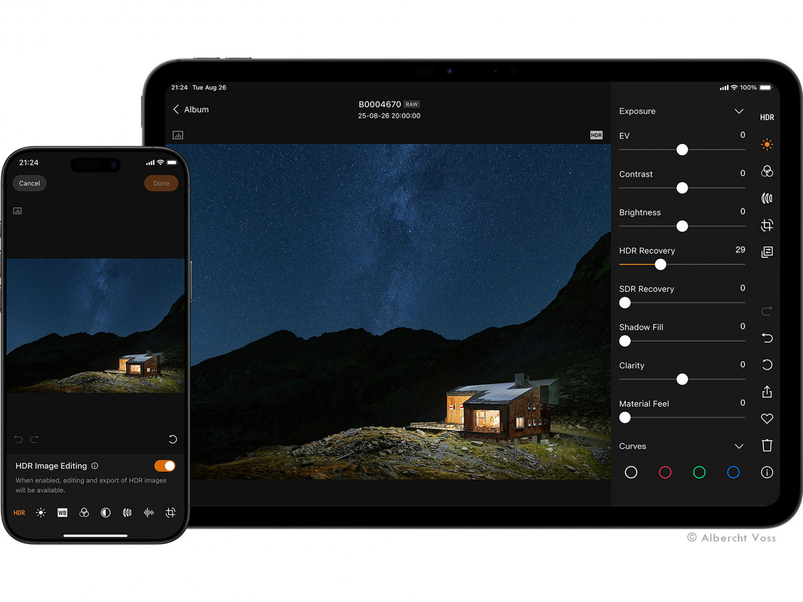 Полная реализация HDR на всех этапах обработки позволяет получить кадры в форматах HDR HEIF и Ultra HDR JPEG, оценивая их прямо на встроенном дисплее.